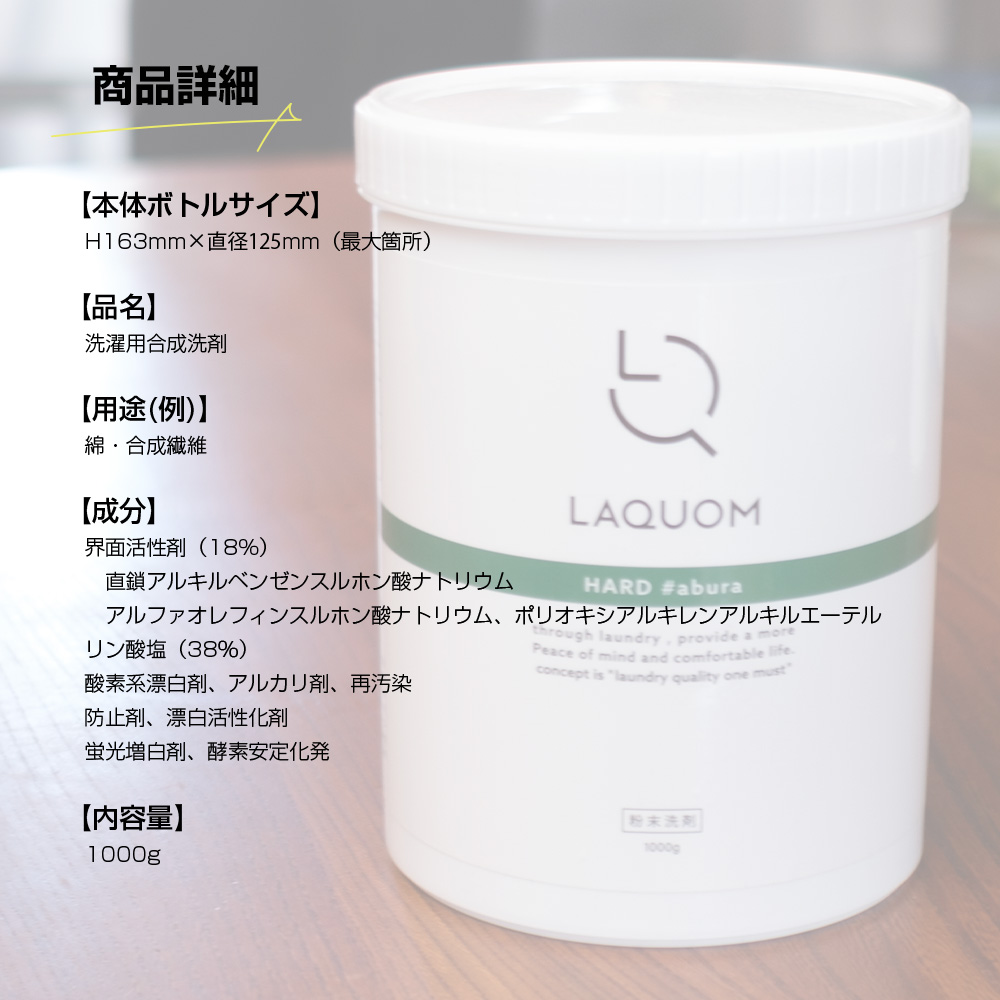"油汚れに特化した作業服洗剤"作業服等に付着した機械油や皮脂などの頑固な汚れや臭いをしっかり落とすには、一般衣類用洗剤では困難です。【LAQUOM HARD#abura】は、そんな油汚れに特化した成分配合にて風合いを保ちながらも頑固な油汚れや臭いを強力にしっかり落とすことを実現した洗剤です。